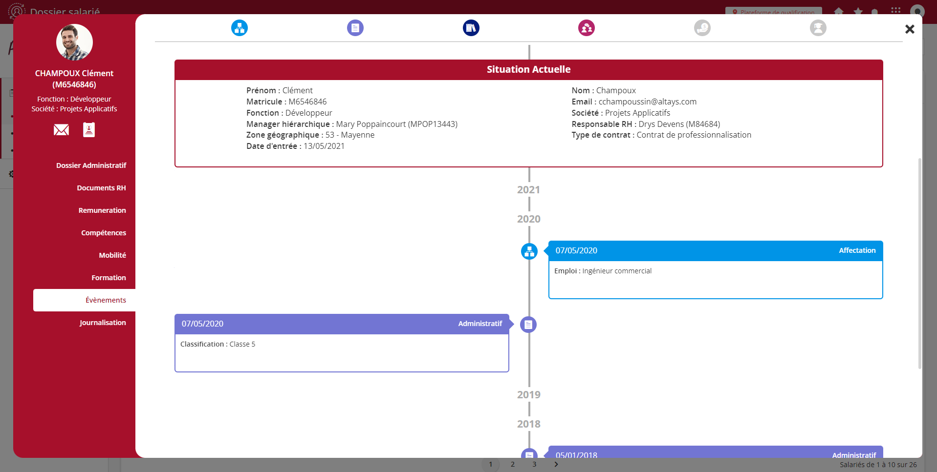La fonctionnalité “Gestion des événements” disponible dans la version premium du Dossier Salarié permet de gérer et d’afficher les évènements de la carrière du collaborateur sous forme de frise chronologique.
