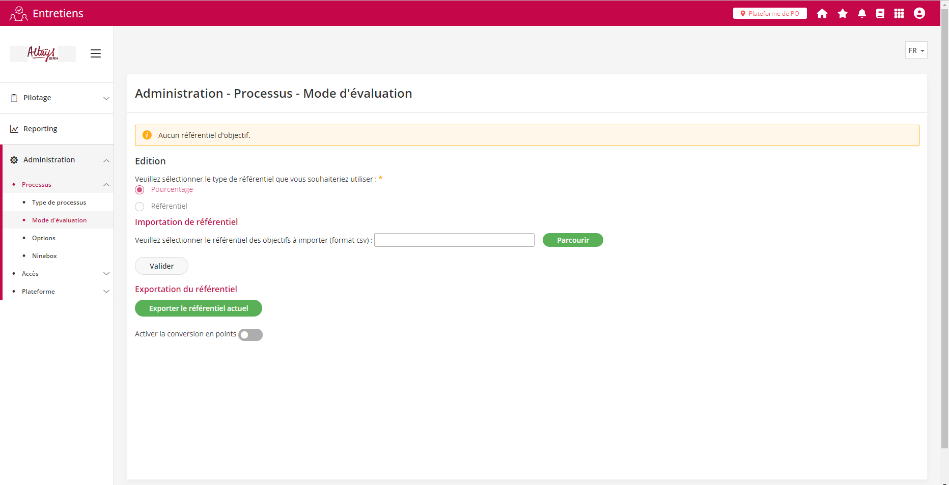 Dans le cas du mode “Référentiel”, un import des valeurs doit être effectué par fichier .csv.