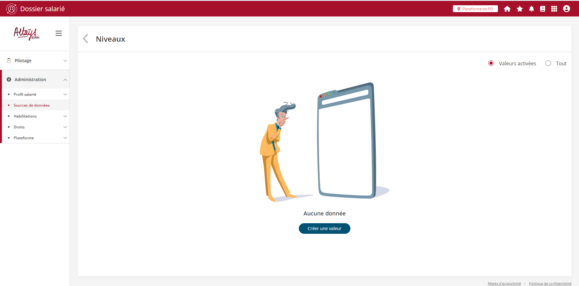 Lorsque le référentiel ne contient aucune valeur le bouton d’ajout se trouve au centre de l'écran, il se déplace par la suite à droite lorsque des valeurs sont affichées au centre.