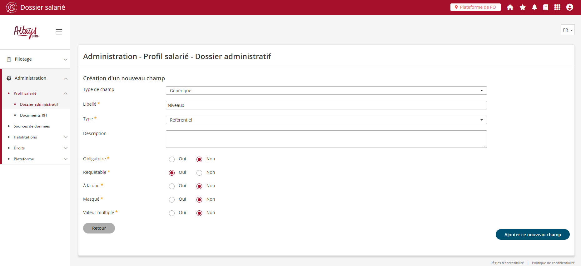 Le référentiel générique peut également être créé indirectement dans les sources de données lors de la création d’un champ générique. Lorsque le champ générique créé est de type “référentiel”, sa création va engendrer en parallèle l’ajout du référentiel correspondants dans les sources de données.