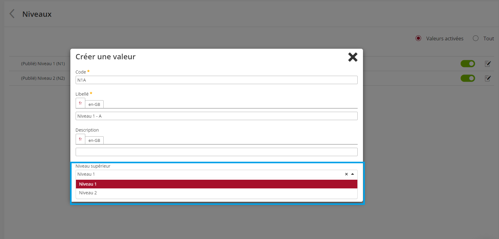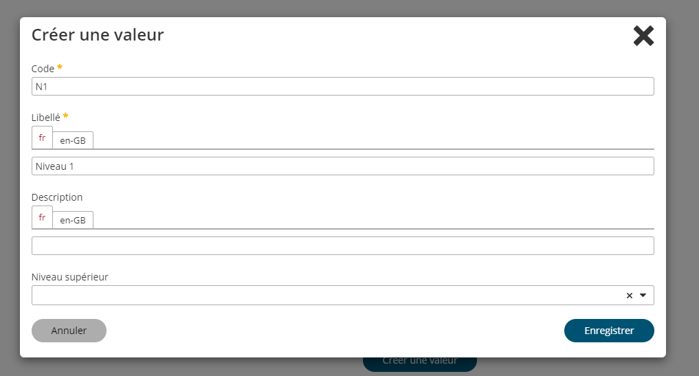 Les référentiels génériques permettent de créer des référentiels simples, sur un seul niveau, mais également des référentiels sous forme d’arborescence. Cette arborescence se créé en rattachant les valeurs ajoutées à des valeurs parentes via le champ “Niveau supérieur”.