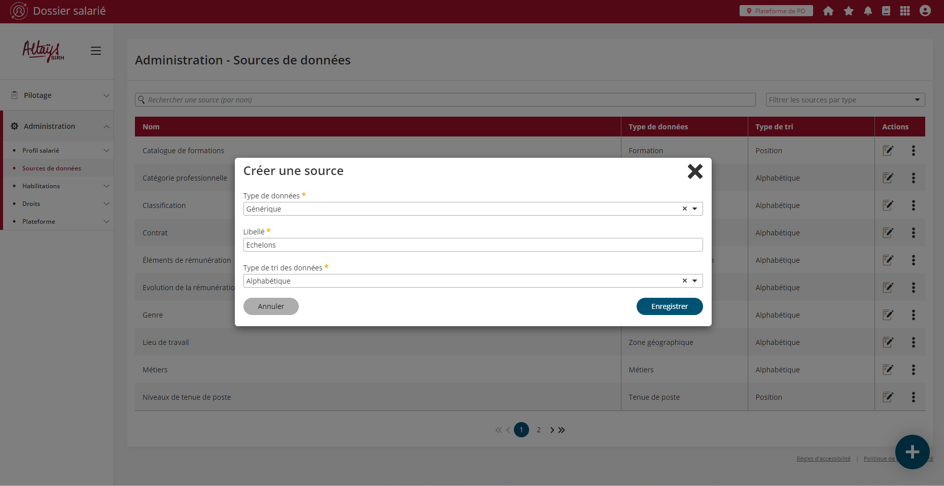 Une fenêtre modale est alors affichée et présente un formulaire à compléter. Le champ “Type de donnée” affiche la liste des référentiels systèmes / métiers disponibles et non activés jusque là ainsi qu’une valeur “Générique”. Pour créer un référentiel générique il faut sélectionner cette dernière valeur puis compléter la suite du formulaire (libellé et type de tri) et enregistrer.