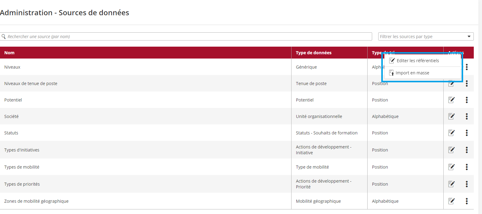 Comme tous les autres référentiels, les référentiels génériques s'éditent via deux options disponibles en cliquant sur le pictogramme “trois points”: