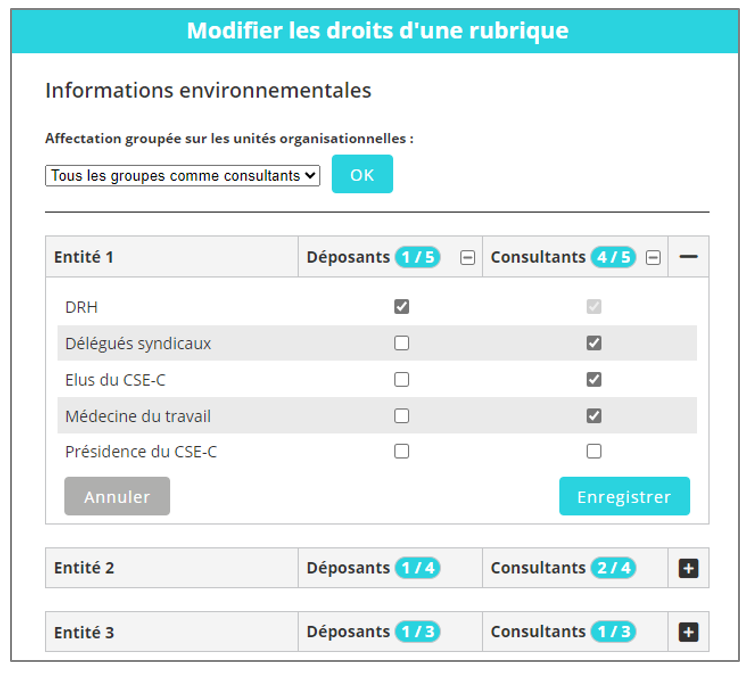 • Droits de consultation : tous les utilisateurs rattachés à ce groupe deviennent éligible à la consultation des informations mise à disposition dans cette rubrique. C’est-à-dire que lorsqu’un déposant va mettre à disposition un document dans la rubrique, il se verra proposer de le mettre en visibilité des utilisateurs de ce groupe.