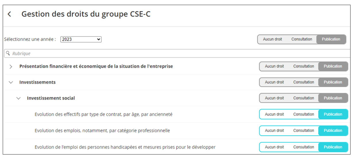 • Soit en partant d’une rubrique, en définissant pour chacun des groupes utilisateurs existants les droits dont il dispose :
