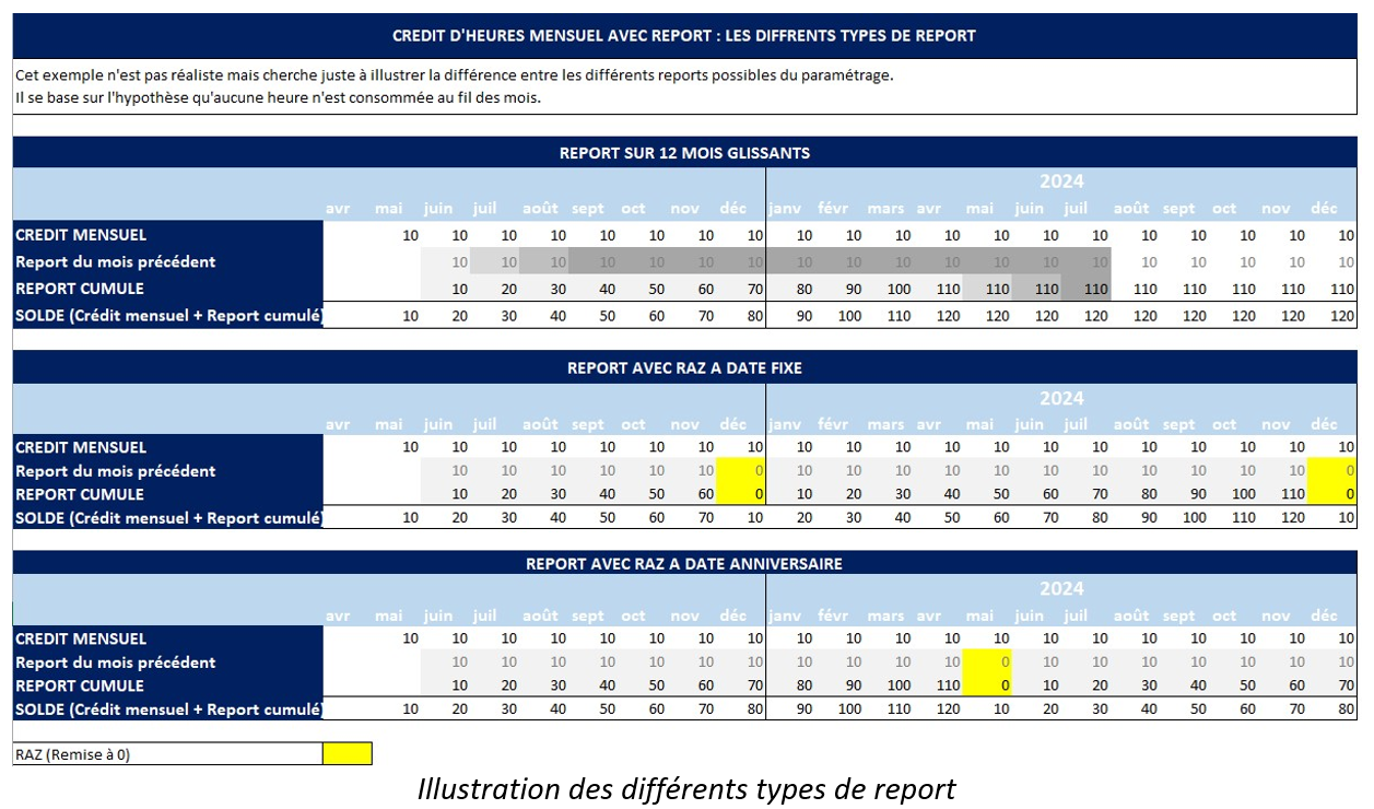 - Pas de report => les heures créditées en début de mois et non utilisées à la fin du mois sont perdues. C’est par exemple le cas des heures de représentation syndicale.