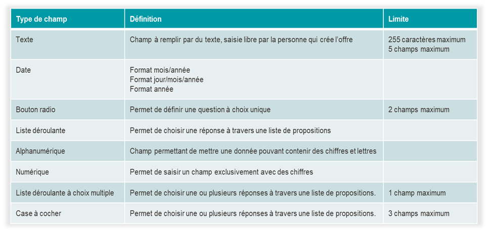 - Affichés sur le site : les champs sont visibles sur la Bourse à l’emploi par le candidat.