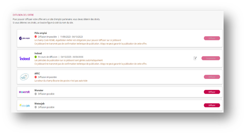 Depuis la synthèse de l’offre vous disposez d’une section « Diffusion de l’offre » qui a pour but de gérer la diffusion sur les différents Jobboards. Naturellement pour pouvoir diffuser vers un site, il faut détenir les droits. Si vous détenez ces droits alors un bouton figure à côté du nom du site. N’hésitez pas à vous rapprocher d’ALTAYS si vous souhaitez élargir votre diffusion vers des jobboards complémentaires.