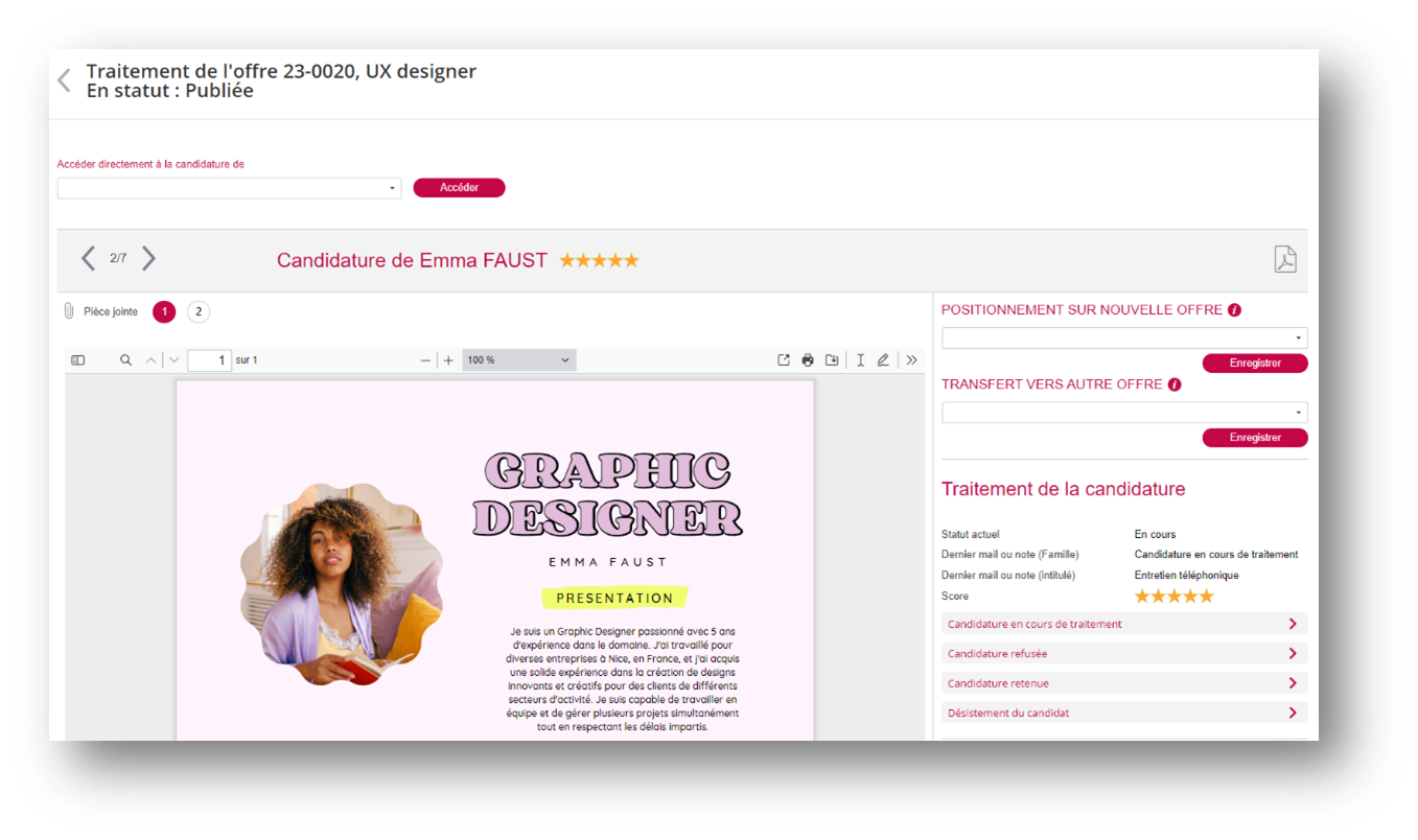 Ce bouton vous permet d’accéder à un moteur de recherche permettant de retrouver des candidatures en croisant des critères sur offres et des critères sur candidatures. Le résultat de votre recherche vous permet d’accéder à la liste des candidatures correspondant à votre requête et à leur dossier.