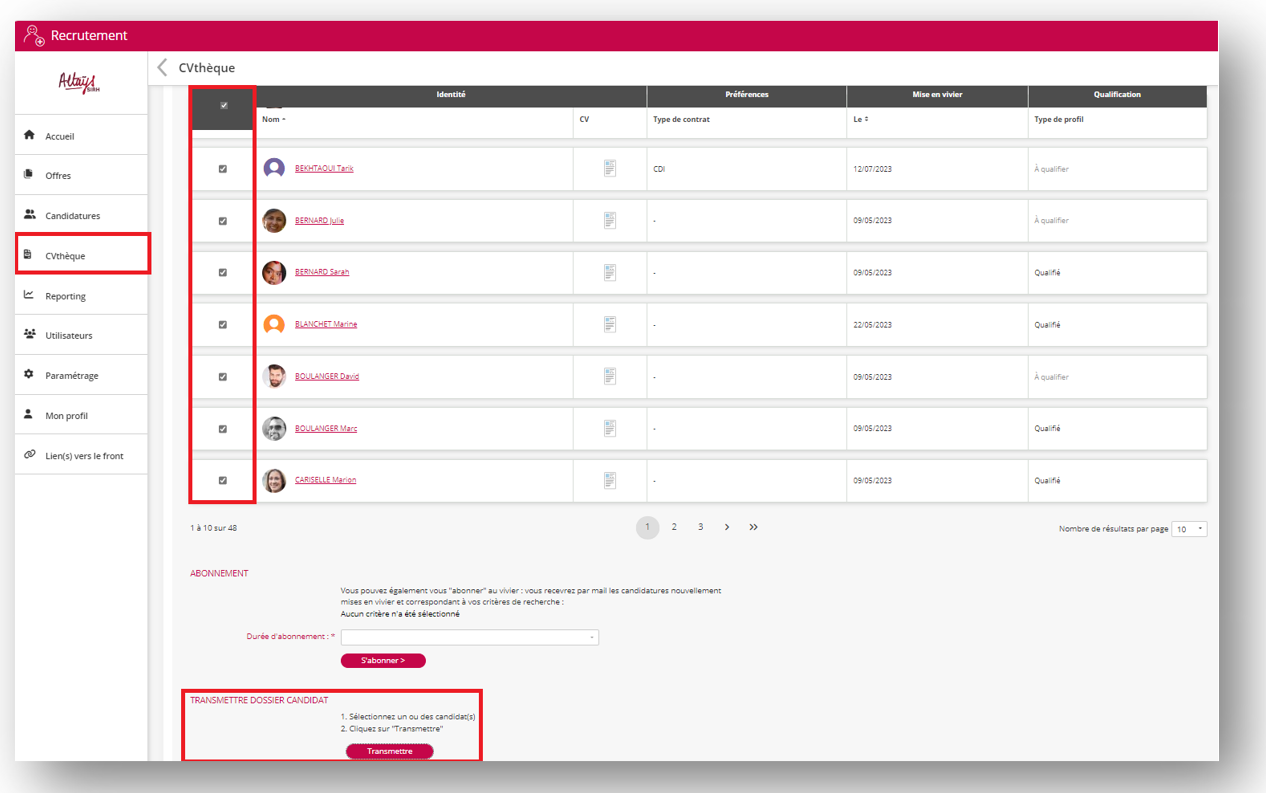 Les fonctionnalités qui suivent sont les mêmes que celles proposées dans l’onglet « Candidatures ».