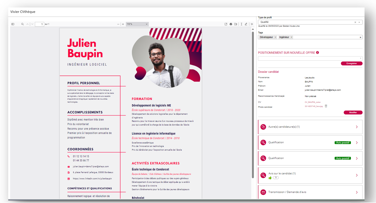 Si le recruteur clique sur un CV, il accède au viewer qui offre de nombreuses fonctionnalités :