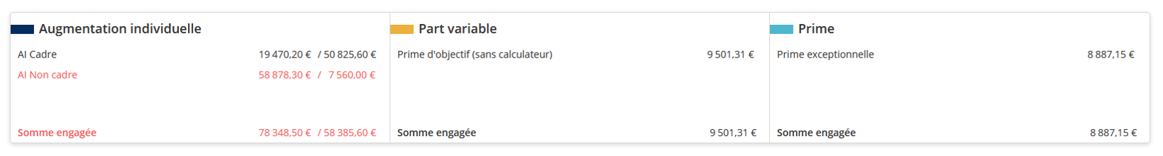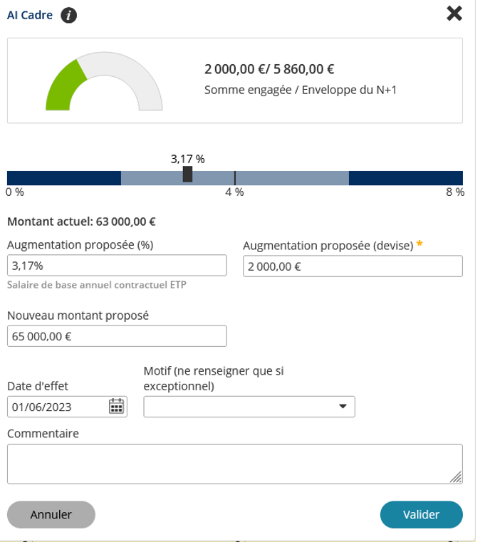 • Une valeur recommandée optionnelle, qui donne une indication supplémentaire au manager si nécessaire. Cette valeur recommandée peut être paramétrée pour correspondre à la contribution à l’enveloppe, ou non.