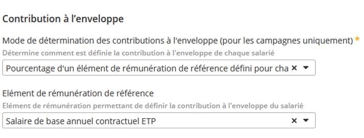 On paramètrera alors le dispositif sur une contribution en % de l’élément de rémunération « Contribution enveloppe AI », puis lors de la mise en œuvre du dispositif sur la campagne, on renseignera une contribution de chaque salarié à 100 %.