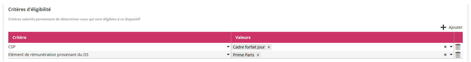 Il est possible d’ajouter un ou plusieurs critères d’éligibilité à un dispositif ; ces critères permettant de déterminer quels sont les salariés pouvant en bénéficier.