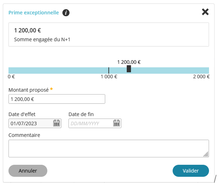• La date d’effet de la proposition (ex : augmentation de salaire rétroactive, prime à verser dans 2 mois etc). Il y aura 2 façons ensuite de la renseigner : soit par l’administrateur à la mise en œuvre du dispositif sur la campagne - elle sera alors la même pour tous les salariés et les managers/acteurs RH n’auront pas la main dessus - soit par le manager lors de la proposition.