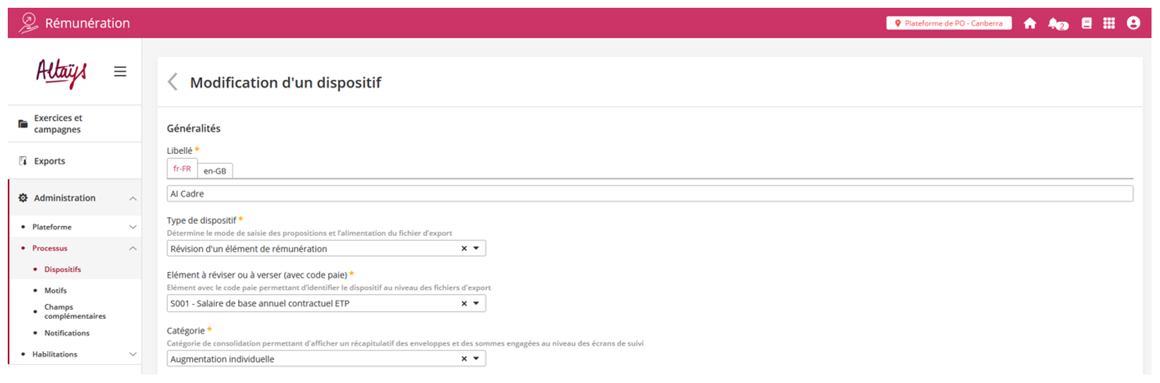 Les dispositifs sont paramétrables depuis le menu Administration> Processus> Dispositifs.