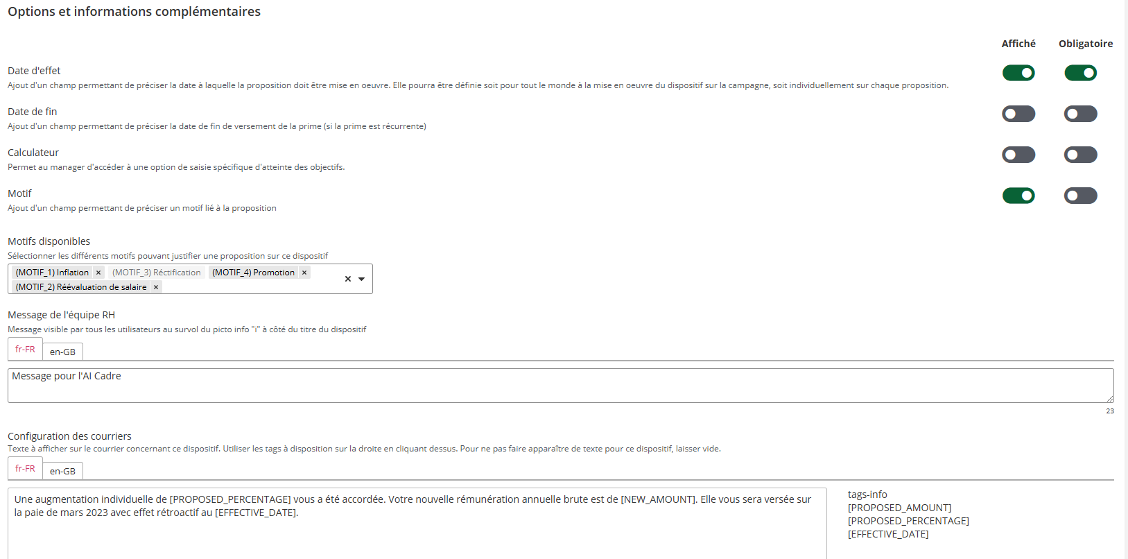 • Un message : cette zone permet d’ajouter une note d’information sur le dispositif à destination des managers et/ou des acteurs RH qui s’affichera au survol sur le picto « i » près du titre du dispositif.