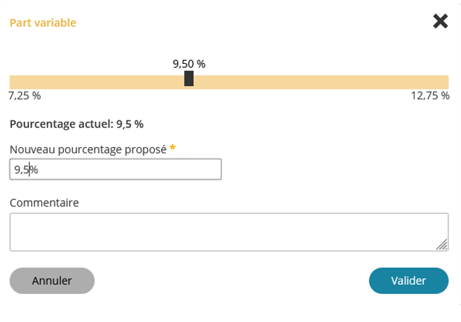 •           Parfois il peut s’agir de réviser un élément de rémunération au format pourcentage (ex. part variable contractuelle). On passe alors du pourcentage actuel à un nouveau pourcentage, il n’y a pas de montant sur ce type de dispositif.