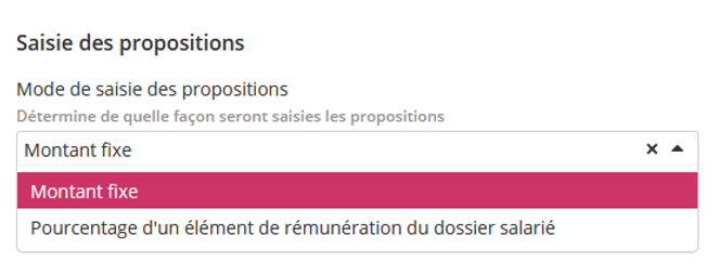• Saisie en pourcentage d’un élément de rémunération, auquel cas il faut préciser l'élément de rémunération de référence (qui sera forcément un montant) – ex. x % d’un montant max pour une prime d’objectif.