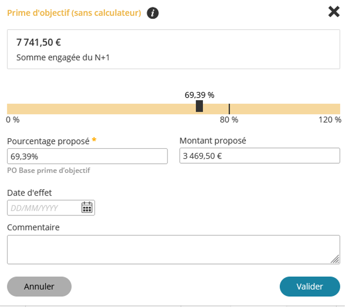 - Un calculateur spécifique : cette option permet d’afficher au manager une aide à la saisie dans le cadre de la prime d’objectif ; il ne saisit pas directement une proposition d’augmentation ou de montant à verser mais un taux de complétion des objectifs en pourcentage permettant de calculer le montant final.