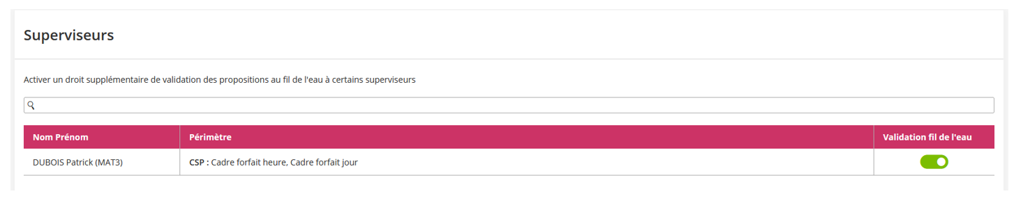 Côté Rémunération, le superviseur peut se voir attribuer un rôle supplémentaire de validation des propositions au fil de l’eau (si le fil de l’eau est activé sur la plateforme du client). L’administrateur doit lui activer ce droit depuis le menu Administration> Habilitations> Superviseurs.
