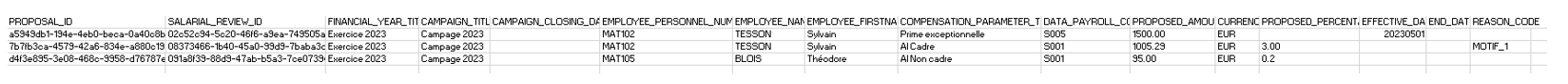 Un fichier csv est généré avec une ligne par révisions salariales au statut « A exporter », que celle-ci provienne d’une campagne clôturée ou du fil de l’eau.