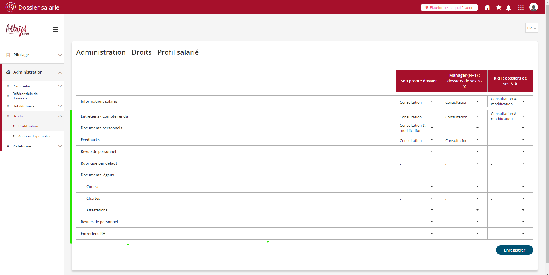 Le menu Administrations > Droits > Profil salarié permet configurer les droits sur les différentes rubriques des documents RH. Sous la ligne dédiée à la configuration des droits sur le dossier administratif (Informations salarié), l’arborescence qui a été configurée préalablement (apparaît dans la page pour permettre de définir sur chaque rubrique quels sont les droits appliqués pour: