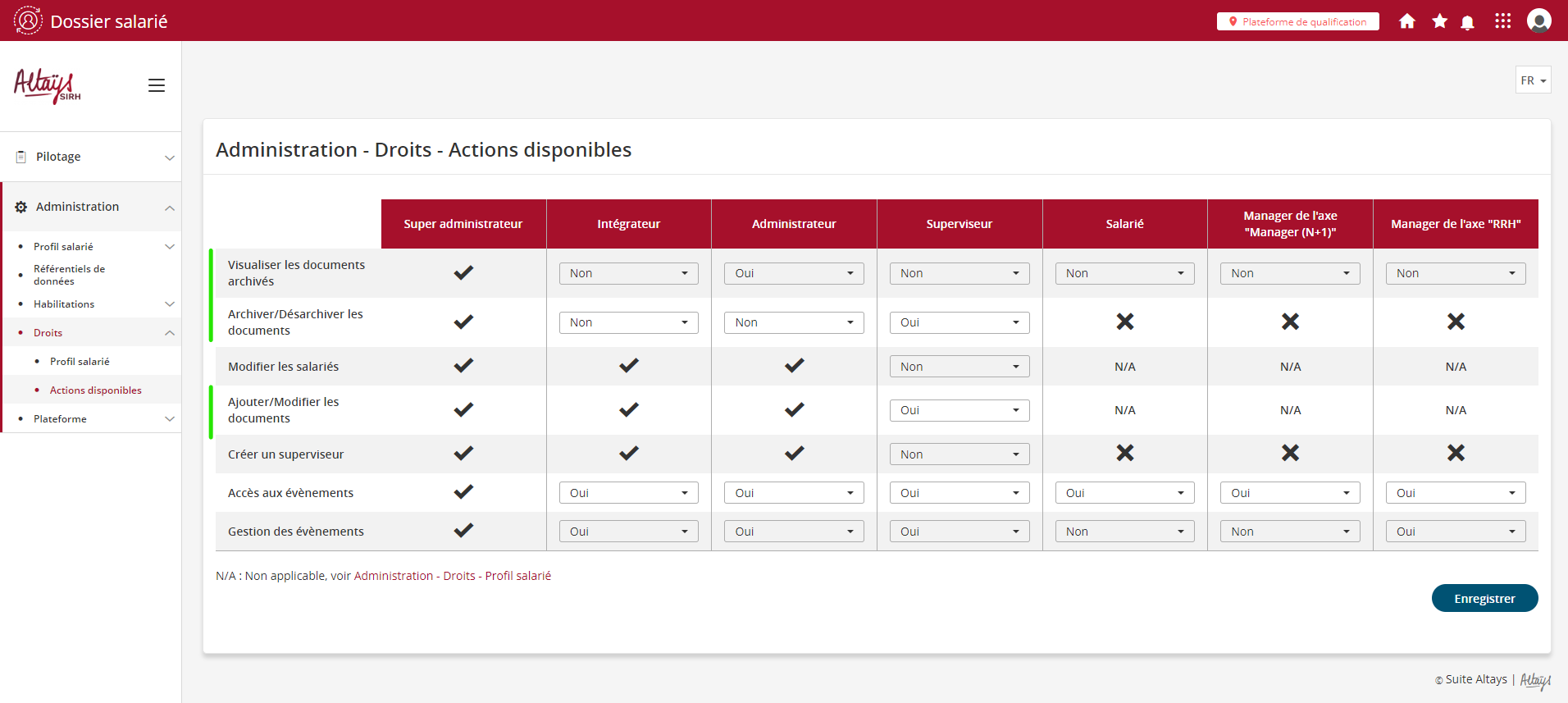 Les profils Administrateurs et Superviseurs ont par défaut accès à toutes les rubriques. C’est la raison pour laquelle on ne retrouve pas ces profils dans la configuration des droits. Néanmoins il est possible de configurer certaines modalités d’accès pour ces profils mais celles-ci s’appliqueront alors sur toutes les rubriques. Cette configuration se fait dans le menu Administrations > Droits > Actions disponibles.