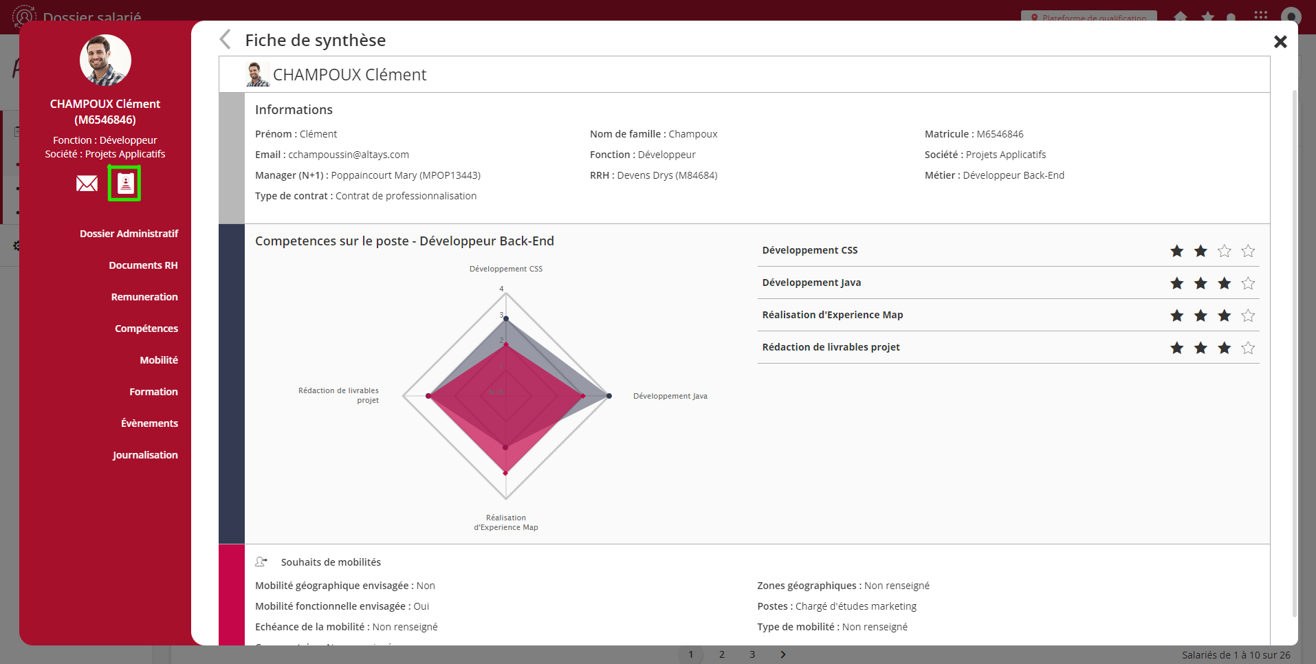 Une fiche de synthèse est proposée dans le dossier collaborateur, elle est accessible en cliquant sur le pictogramme situé dans le bandeau de gauche sous la photo.