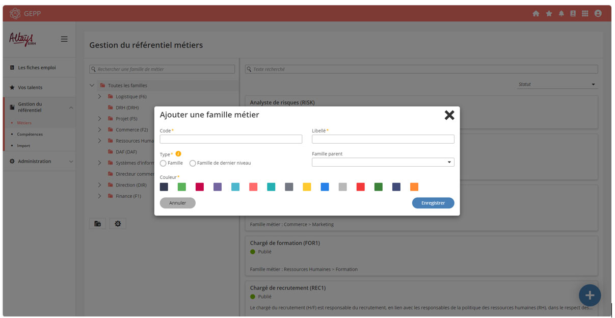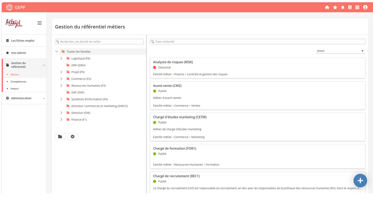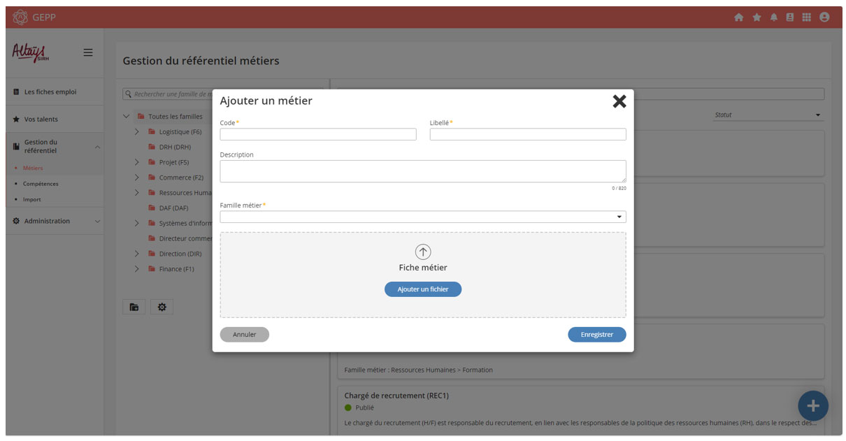 Une fois l’arborescence des emplois créée, des emplois peuvent être définis et rattachés à la structure. Une zone permet de décrire l’emploi de manière succincte, un autre champ permet d’ajouter une pièce jointe si une description plus détaillée doit y être associée. Ces informations permettent d’enrichir la bibliothèque de fiches métiers qui peut être mise à disposition des collaborateurs (option de l’administrateur Altays).