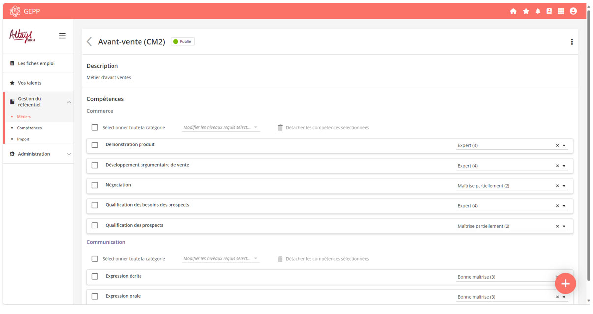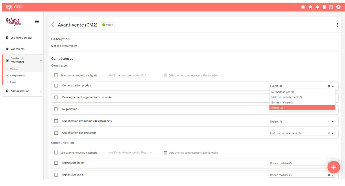 Les compétences sélectionnées apparaissent dans l'écran initial, il reste alors à définir le niveau requis sur l'échelle héritée de la famille de compétences.