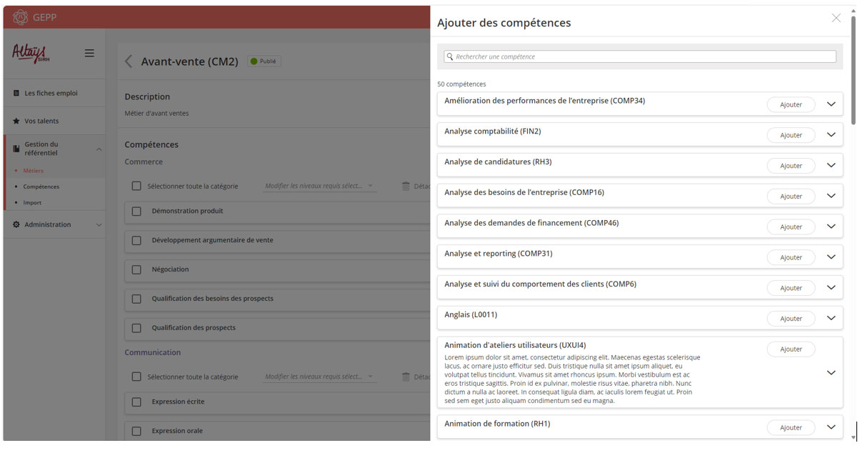 Le bouton d’ajout ouvre une fenêtre affichant la liste des compétences disponibles.