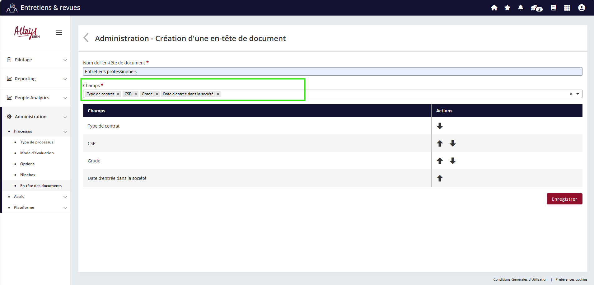 Lors de la création ou l'édition d'une entête, la sélection de champ dans la liste du dossier administratif permet de déterminer les valeurs à produire dans l'entête.
