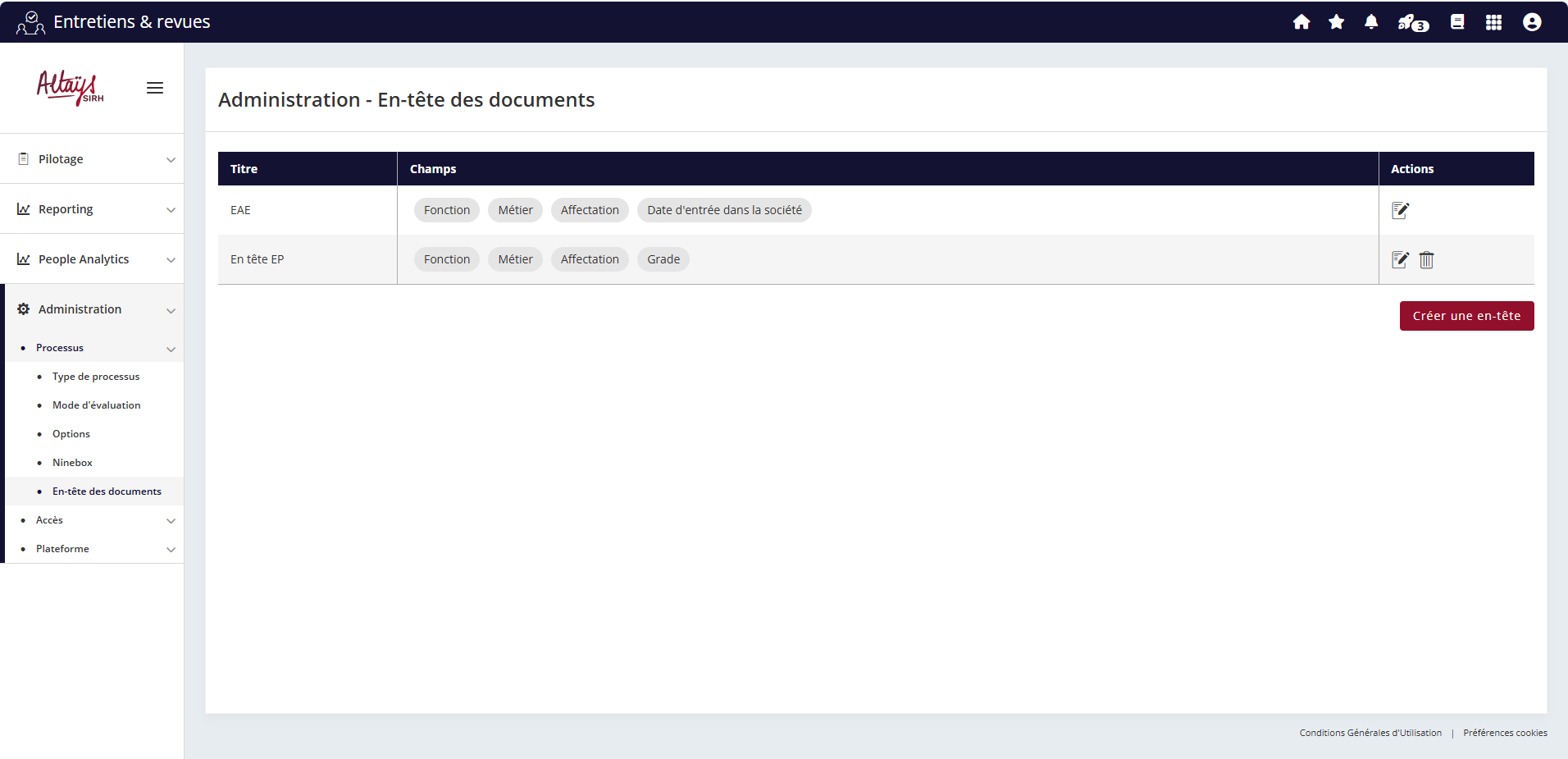 Le menu "En-tête des documents" permet de créer et gérer différents modèles ensuite utilisable par la configuration des types de processus.